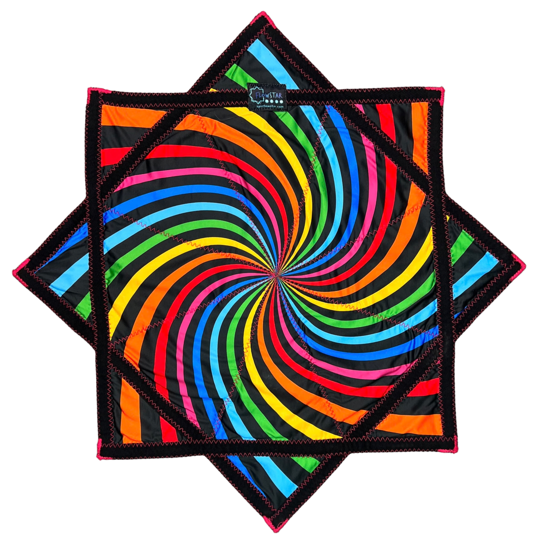 - This textile is an eight-pointed, symmetrical star with sharp, evenly spaced points formed by triangular quilted sections. The overall color palette is bright and cheerful, featuring black as the primary background with rainbow hues including red, orange, yellow, green, blue, and pink, creating a lively and playful visual tone. The design displays a swirling spiral pattern made of curved rainbow stripes that radiate from the center and flow outward across each triangular section. The trim is solid black fabric that outlines the entire perimeter of the star and forms angular bands connecting the points. Bright pink zigzag stitching is clearly visible along the seams and trim edges, securing each triangular panel and adding a textured, handcrafted finish. A small fabric brand label is visible near the top point.