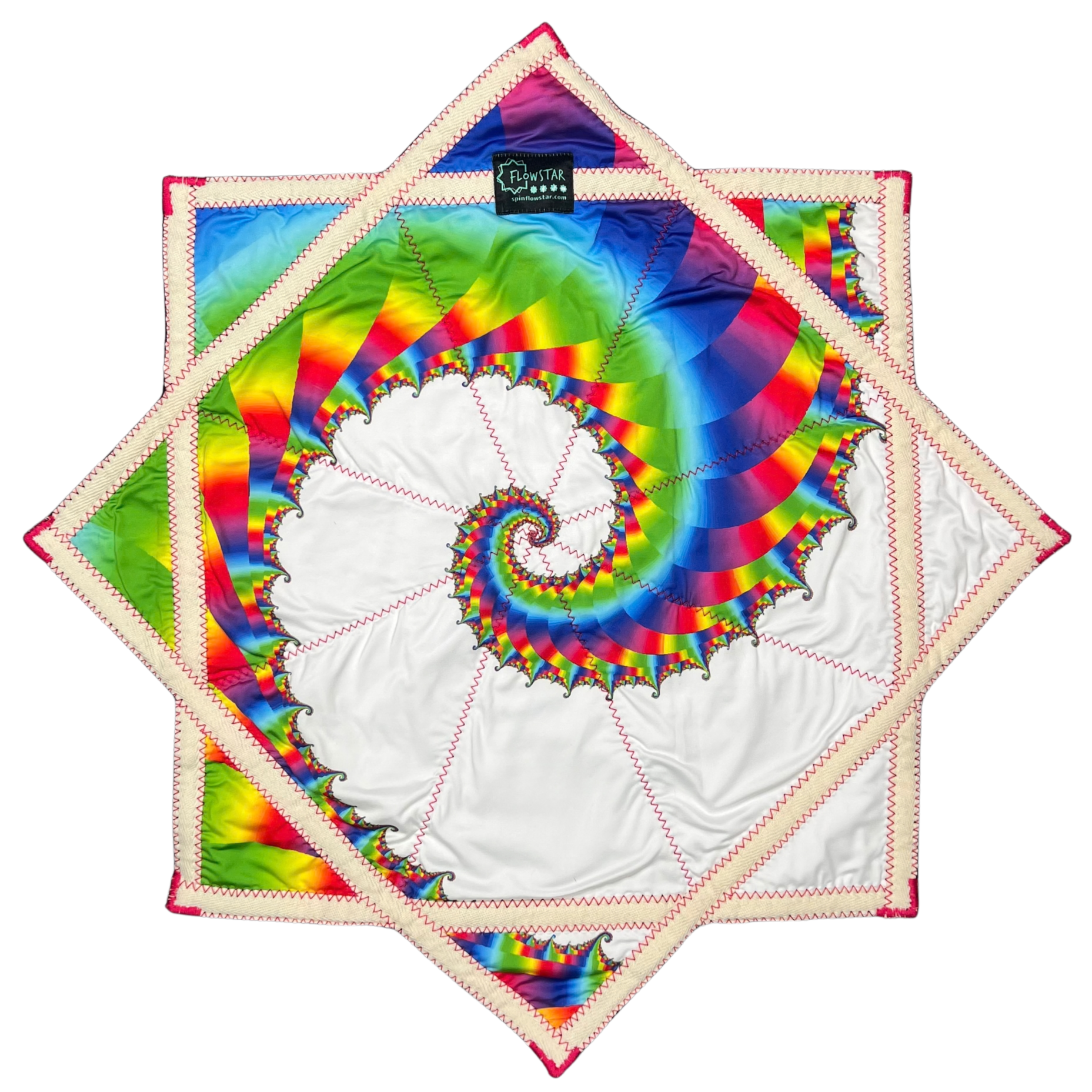 - This textile is an eight-pointed, symmetrical star with sharp, evenly spaced points formed by triangular quilted sections. The overall color palette is vivid and high-contrast, combining a white background with saturated rainbow colors, creating a visually energetic and detailed appearance. The design features a fractal-style spiral pattern in rainbow gradients, with repeating curved shapes that decrease in size as they spiral toward the center and extend across the triangular panels. The trim is solid cream-colored fabric that outlines the entire perimeter of the star and forms angular bands connecting the points. Pink zigzag stitching is clearly visible along the seams and trim edges, securing each triangular panel and adding a textured, handcrafted finish.