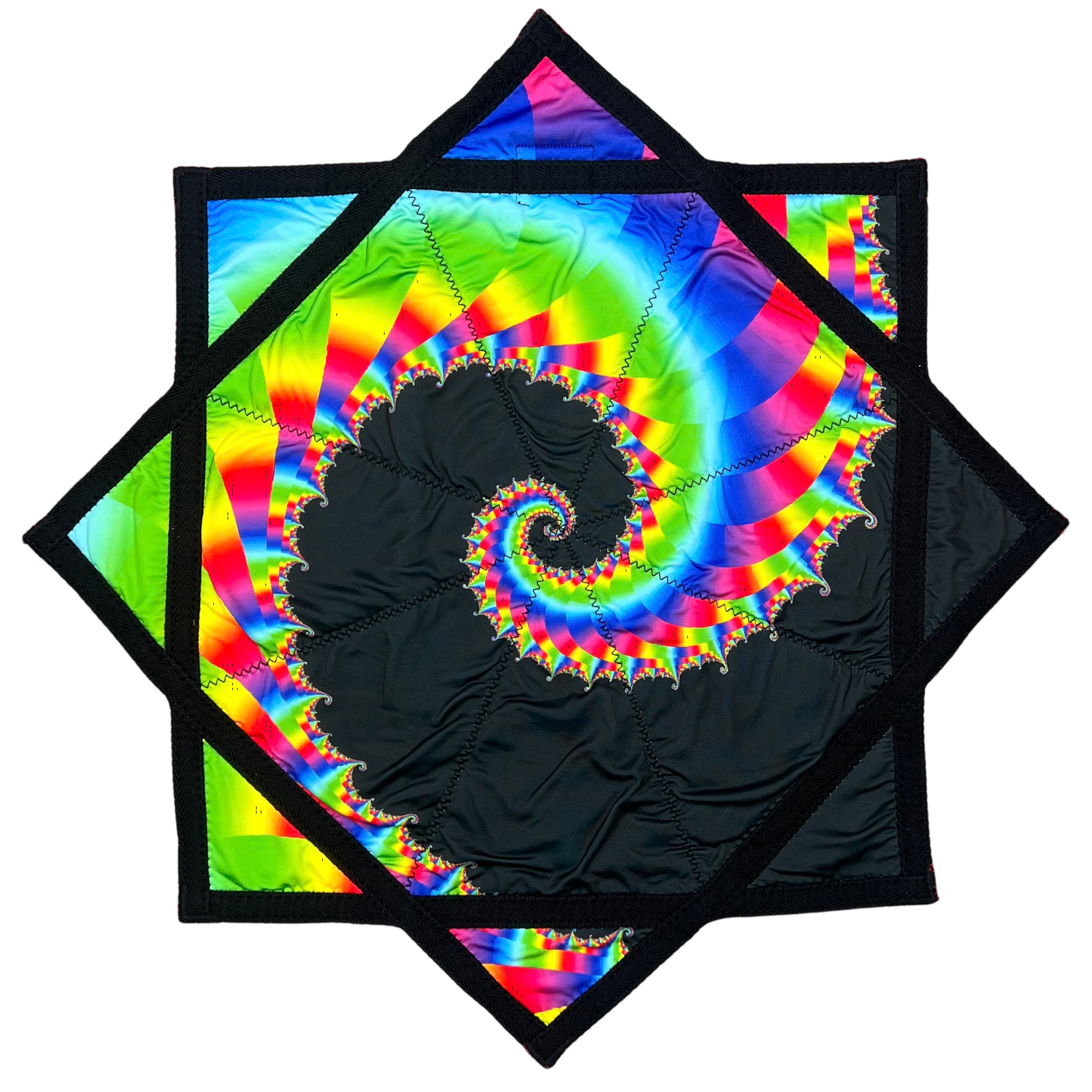 - This textile is an eight-pointed, symmetrical star with sharp, evenly spaced points formed by triangular quilted sections. The overall color palette is vivid and high-contrast, combining a black background with saturated rainbow colors, creating a visually energetic and detailed appearance. The design features a fractal-style spiral pattern in rainbow gradients, with repeating curved shapes that decrease in size as they spiral toward the center and extend across the triangular panels. The trim is solid black fabric that outlines the entire perimeter of the star and forms angular bands connecting the points. Black stitching is clearly visible along the seams and trim edges, securing each triangular panel and adding a textured, handcrafted finish.