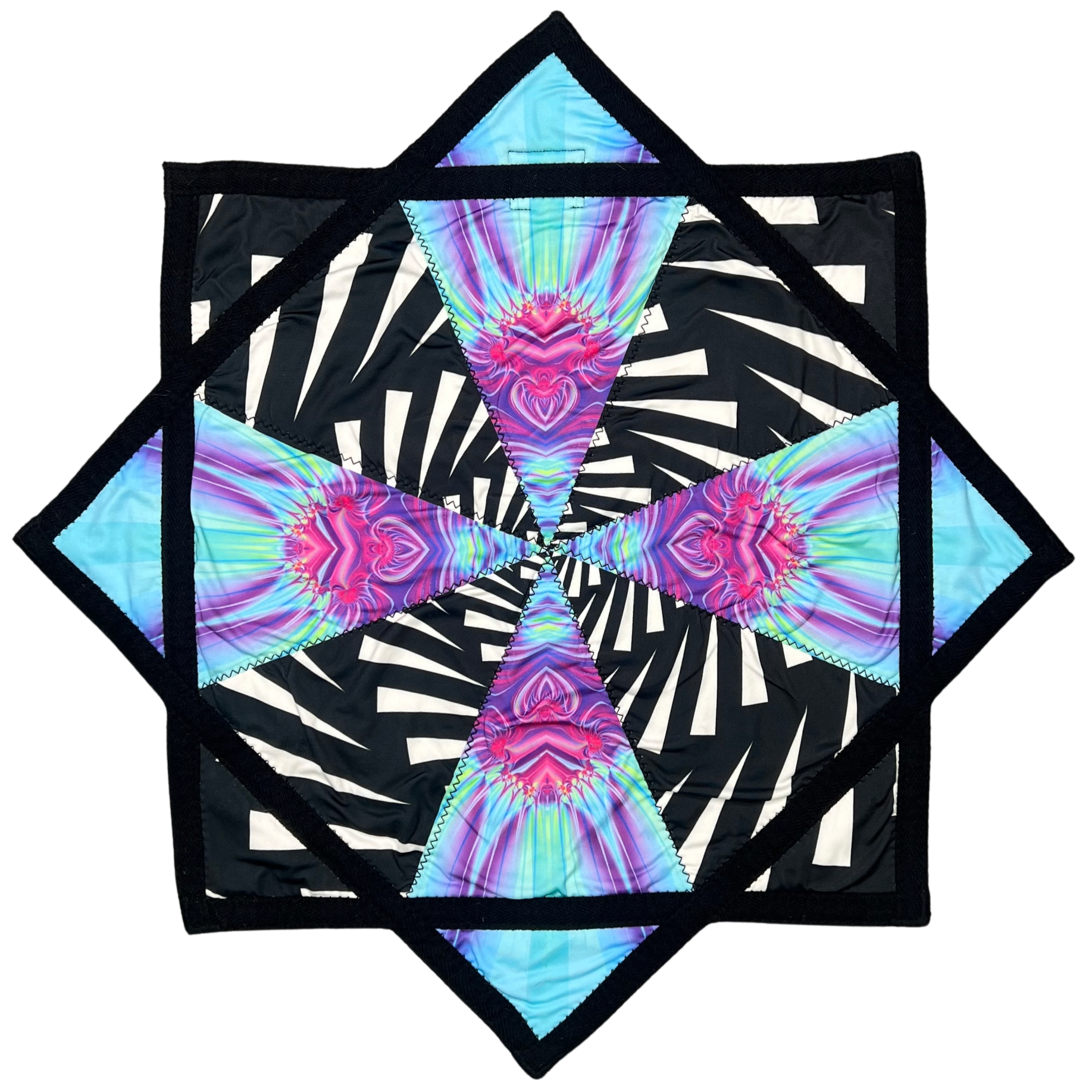 - This textile is an eight-pointed, symmetrical star with sharp, evenly spaced points formed by triangular quilted sections. The overall aesthetic is vibrant and electric, blending black-and-white spiral elements with luminous gradients of aqua, teal, lavender, and bright pink for a visually striking, energetic feel. The design features alternating triangular panels: some display bold black-and-white twisting stripes that create a sense of motion, while others show radiant heart-like shapes and layered color gradients that extend outward from the center, producing a kaleidoscopic, starburst effect. The trim is solid black fabric that outlines the entire perimeter of the star and forms angular bands connecting the points. Black zigzag stitching is clearly visible along the seams and trim edges, securing each triangular panel and adding a textured, handcrafted finish.