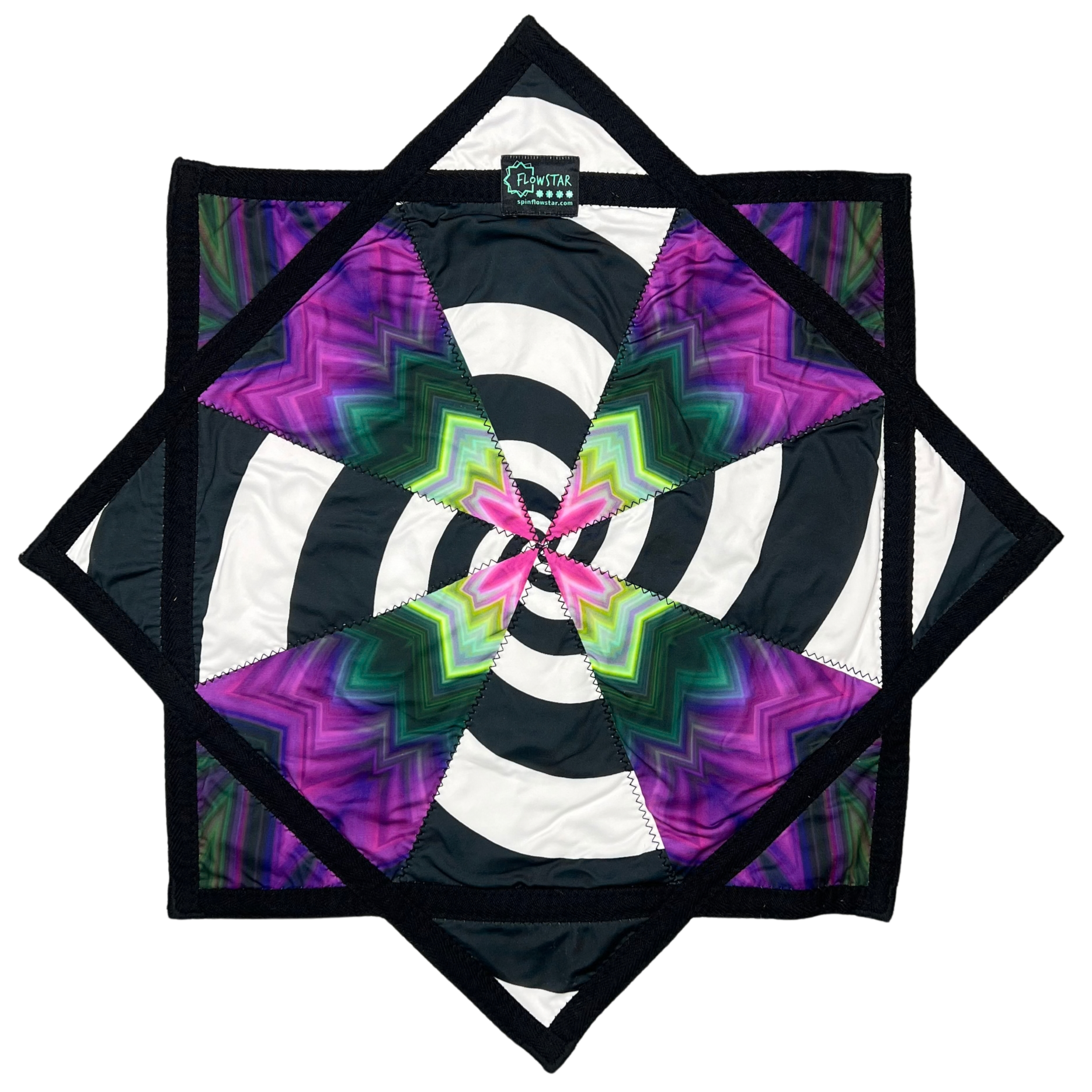 - This textile is an eight-pointed, symmetrical star with sharp, evenly spaced points formed by triangular quilted sections. The color palette is bold and high-contrast, featuring black and white curved stripes layered with vivid purple, neon green, and hot pink accents, creating a dynamic and slightly hypnotic vibe. The design combines sweeping black-and-white arc patterns with radiating zigzag gradients in purple and green that converge toward the center, forming a pinwheel-like focal point with a bright pink core. The trim is solid black fabric that outlines the entire perimeter of the star and forms angular bands connecting the points. Black zigzag stitching is clearly visible along the seams and trim edges, securing each triangular panel and adding a textured, handcrafted finish. A small fabric brand label is visible near the top point.