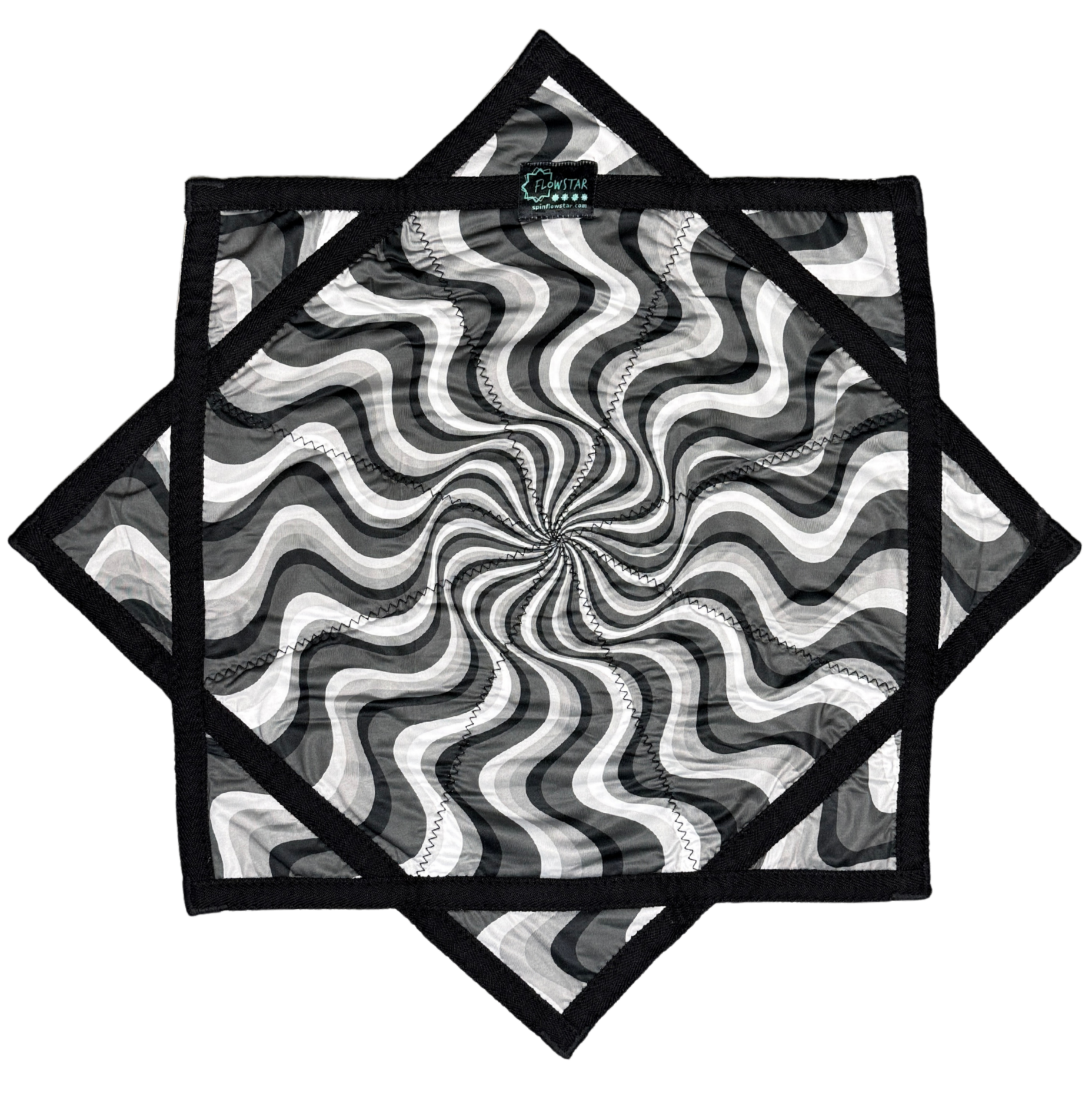 - This textile is an eight-pointed, symmetrical star with sharp, evenly spaced points formed by triangular quilted sections. The overall color palette is monochromatic and graphic, creating a bold, hypnotic vibe using shades of black, charcoal gray, and white. The design features flowing, wavy stripes arranged in a swirling spiral pattern that radiates from the center, producing a strong optical illusion and sense of motion across each triangular panel. The trim is solid black fabric that outlines the entire perimeter of the star and forms angular bands connecting the points. Black zigzag stitching is clearly visible along the seams and trim edges, securing each triangular panel and adding a textured, handcrafted finish. A small fabric brand label is visible near the top point.