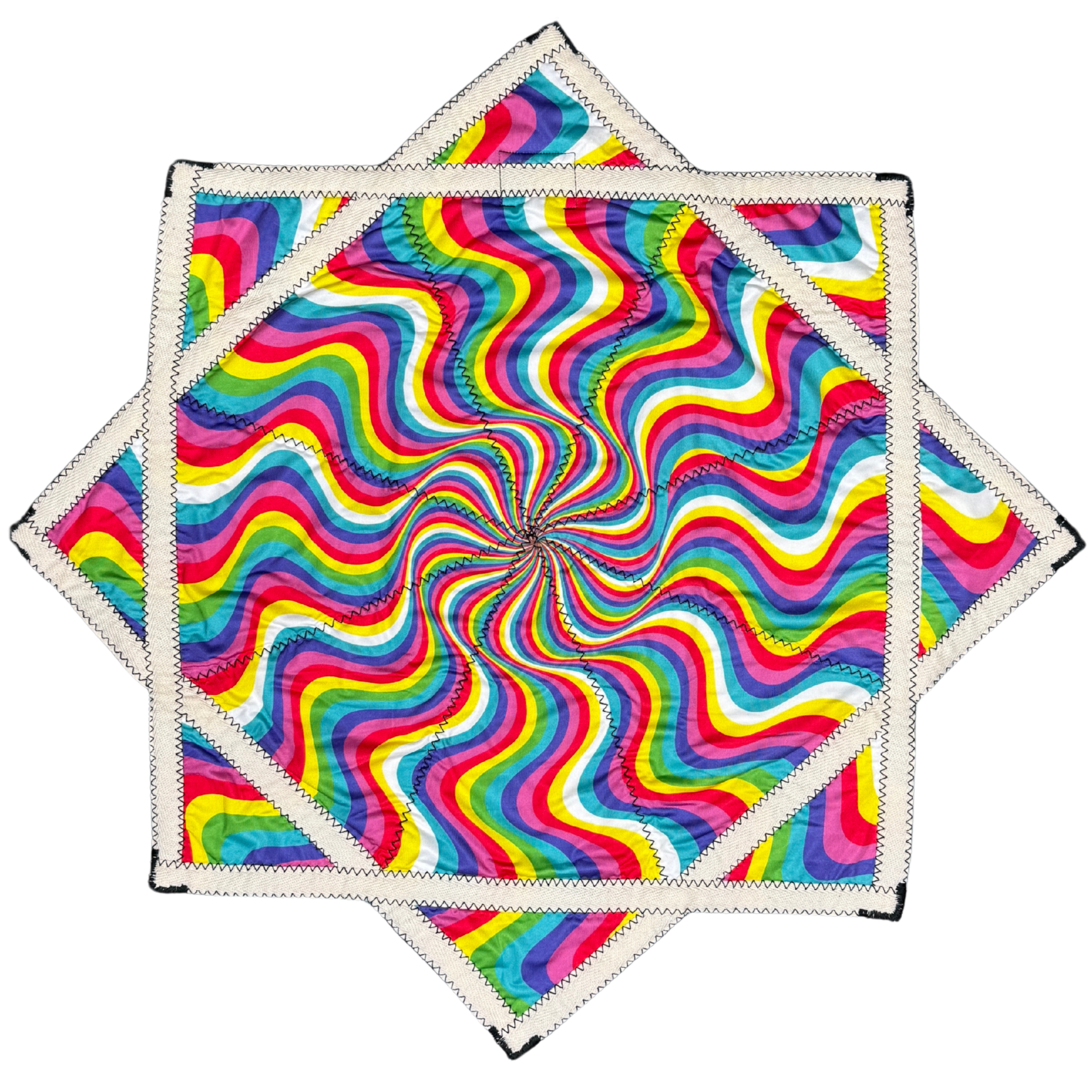 - This textile is an eight-pointed, symmetrical star with sharp, evenly spaced points formed by triangular quilted sections. The color palette is bright and cheerful, giving the piece a playful, high-energy vibe with vivid rainbow hues set against a light background. The design consists of undulating, multicolored stripes in red, orange, yellow, green, blue, and purple that spiral inward toward the center, creating a lively, candy-like swirl effect across the surface. The trim is solid cream-colored fabric that outlines the entire perimeter of the star and forms angular bands connecting the points. Black zigzag stitching is clearly visible along the seams and trim edges, securing each triangular panel and adding a textured, handcrafted finish.
