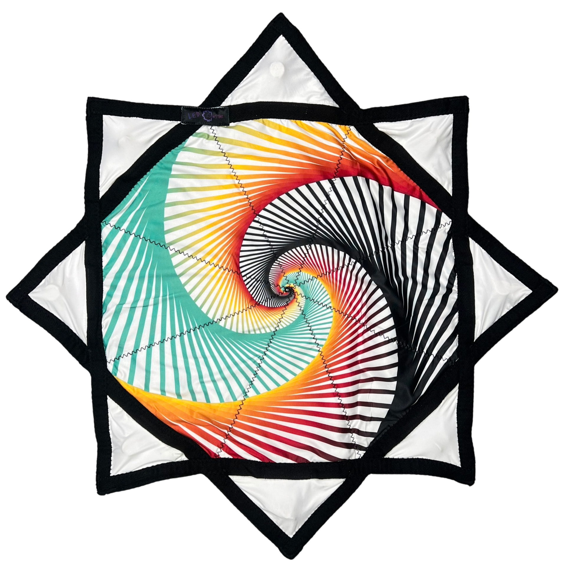 This textile is an eight-pointed, symmetrical star with sharp, evenly spaced points formed by triangular quilted sections. The color palette is vibrant and playful, featuring a black background accented with bright rainbow hues including green, blue, yellow, orange, pink, and purple, giving the piece a lively, dynamic feel. The design consists of a swirling vortex of multicolored dots and small squares arranged in a spiral pattern that tightens toward the center, creating a strong optical illusion of depth and movement. The triangular outer sections are white, creating a crisp border around the central circular motif. The trim is solid black fabric that outlines the entire perimeter of the star and forms angular bands connecting the points. Black zigzag stitching is clearly visible along the seams and trim edges, securing each triangular panel and adding a textured, handcrafted finish. A small fabric brand label is visible near the top point.