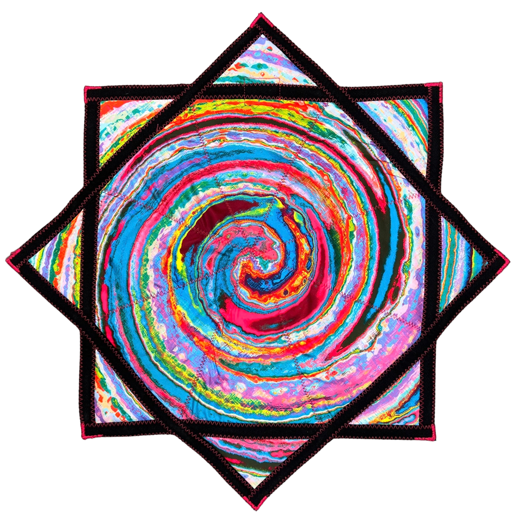 - This textile is an eight-pointed, symmetrical star with sharp, evenly spaced points formed by triangular quilted sections. The design features a vibrant spiral of layered brushstroke-like bands in vivid turquoise, hot pink, bright red, sunny yellow, soft lavender, and accents of white, creating a lively and expressive vibe. The circular pattern winds inward toward the center, with painterly textures and color transitions that give the appearance of hand-blended acrylic paint arranged in a symmetrical spiral formation. The trim is solid black fabric that outlines the entire perimeter of the star and forms angular bands connecting the points. Bright pink zigzag stitching is clearly visible along the seams and trim edges, securing each triangular panel and adding a textured, handcrafted finish.