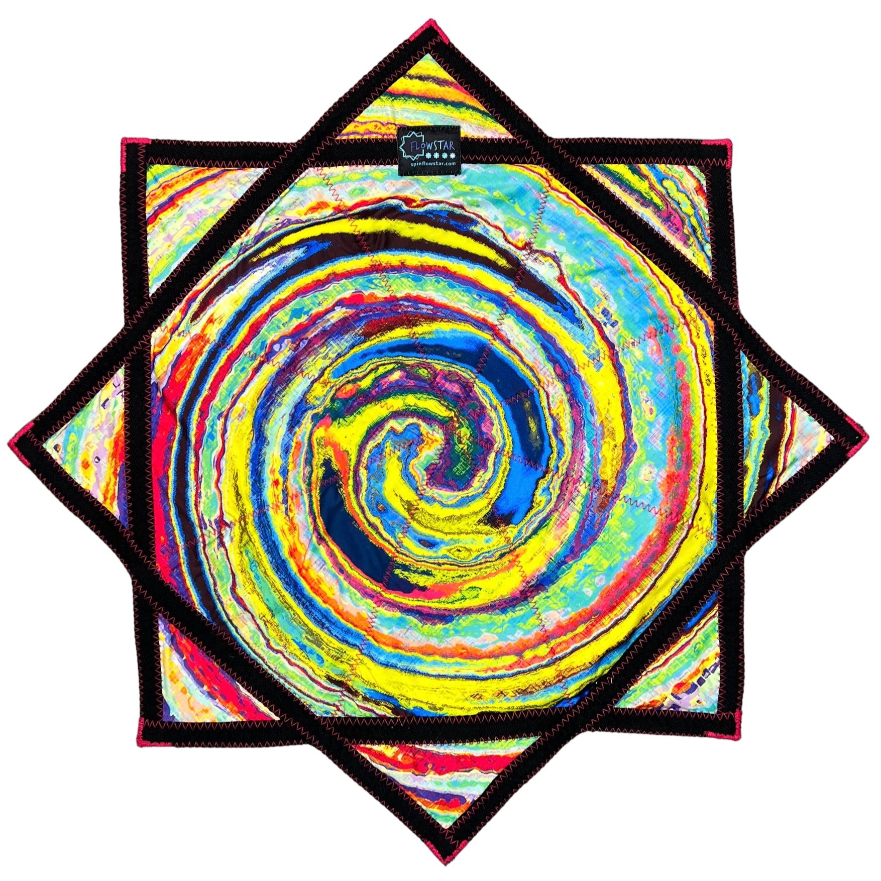 - This textile is an eight-pointed, symmetrical star with sharp, evenly spaced points formed by triangular quilted sections. The design features a vibrant spiral of layered brushstroke-like bands in bright yellow, electric blue, lime green, pink, and touches of white, creating a bold and eye-catching vibe. The circular pattern winds inward toward the center, with painterly textures and color transitions that give the appearance of hand-blended acrylic paint arranged in a symmetrical spiral formation. The trim is solid black fabric that outlines the entire perimeter of the star and forms angular bands connecting the points. Bright pink zigzag stitching is clearly visible along the seams and trim edges, securing each triangular panel and adding a textured, handcrafted finish. A small fabric brand label is visible near the top point.
