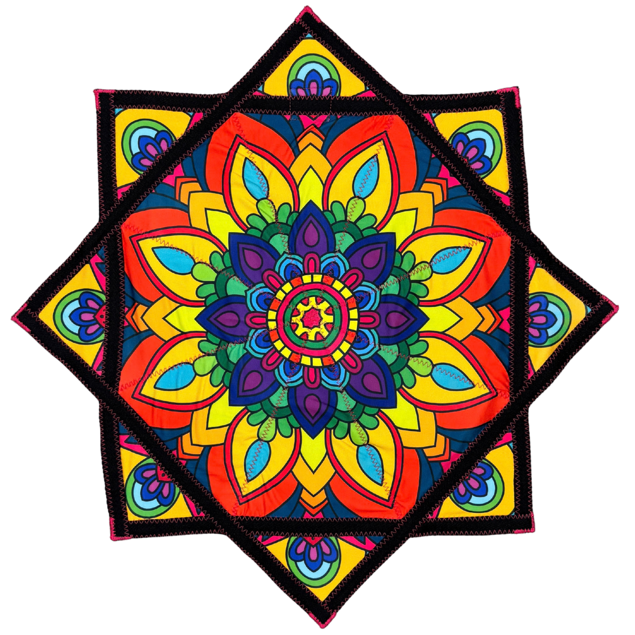 - This textile is an eight-pointed, symmetrical star with sharp, evenly spaced points formed by triangular quilted sections. The color palette is bold and vibrant, featuring bright yellow, orange, red, teal, purple, blue, and green, creating a lively, high-energy, rainbow-inspired vibe. The design forms a detailed mandala pattern radiating from the center, with layered petal shapes, teardrop motifs, and geometric accents arranged in precise circular symmetry. The trim is solid black fabric that outlines the entire perimeter of the star and forms angular bands connecting the points. Cream-colored zigzag stitching is clearly visible along the seams and trim edges, securing each triangular panel and adding a textured, handcrafted finish.