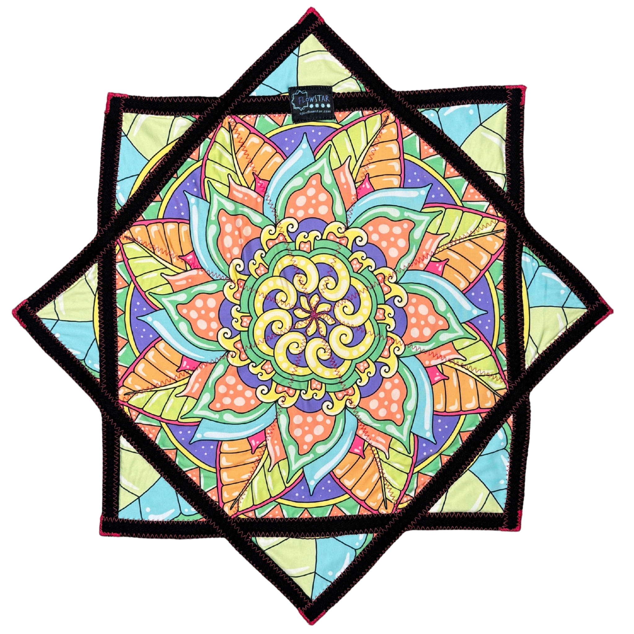 - This textile is an eight-pointed, symmetrical star with sharp, evenly spaced points formed by triangular quilted sections. The color palette is soft yet vibrant, featuring mint green, light teal, peach, coral, lavender, and buttery yellow, creating a cheerful and whimsical vibe. The design displays a detailed mandala-style floral pattern with layered petals, curling vine-like shapes, dotted accents, and leaf motifs radiating outward from a circular center, forming a balanced and harmonious radial composition across each triangular panel. The trim is solid black fabric that outlines the entire perimeter of the star and forms angular bands connecting the points. Bright pink zigzag stitching is clearly visible along the seams and trim edges, securing each triangular panel and adding a textured, handcrafted finish. A small fabric brand label is visible near the top point.