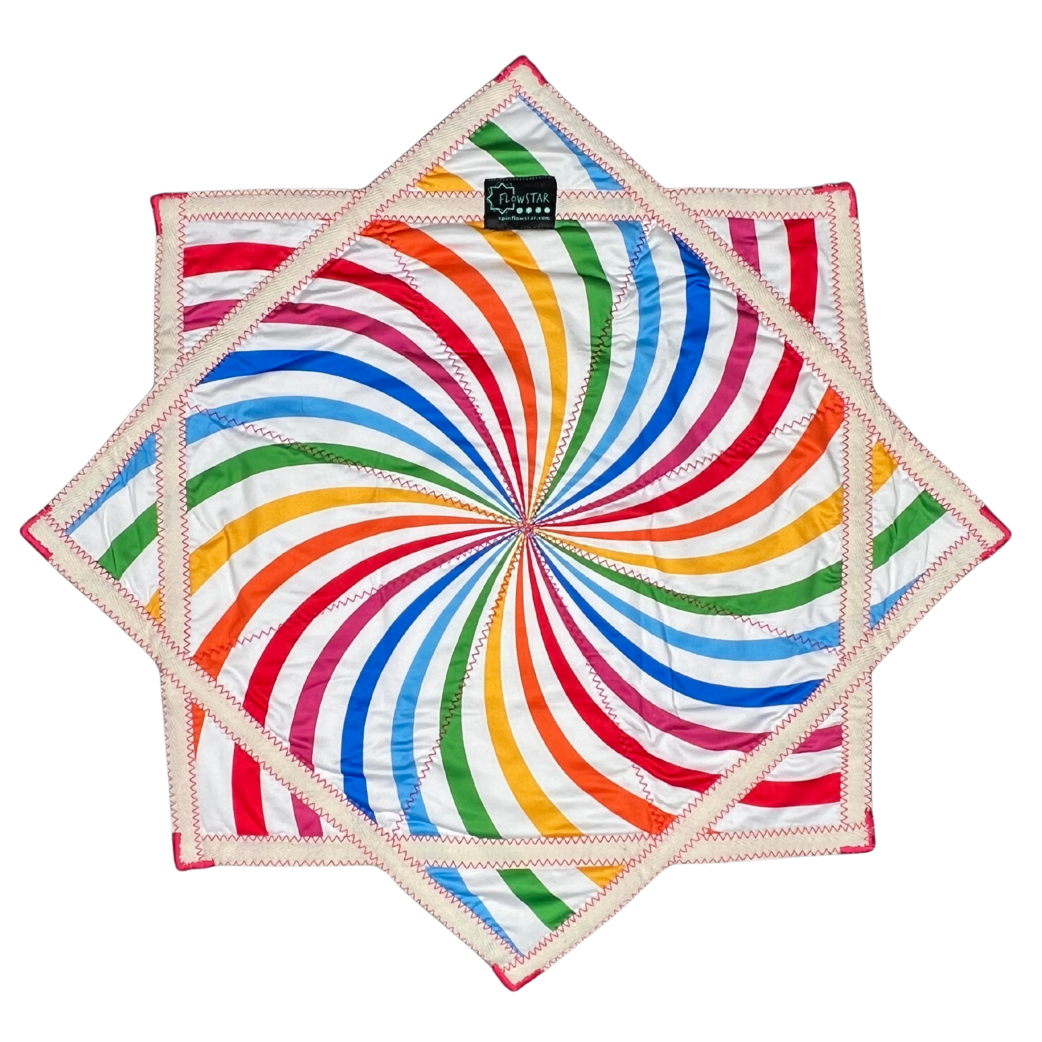 - This textile is an eight-pointed, symmetrical star with sharp, evenly spaced points formed by triangular quilted sections. The overall color palette is bright and cheerful, featuring white as the primary background with rainbow hues including red, orange, yellow, green, blue, and pink, creating a lively and playful visual tone. The design displays a swirling spiral pattern made of curved rainbow stripes that radiate from the center and flow outward across each triangular section. The trim is solid cream-colored fabric that outlines the entire perimeter of the star and forms angular bands connecting the points. Pink zigzag stitching is clearly visible along the seams and trim edges, securing each triangular panel and adding a textured, handcrafted finish. A small fabric brand label is visible near the top point.